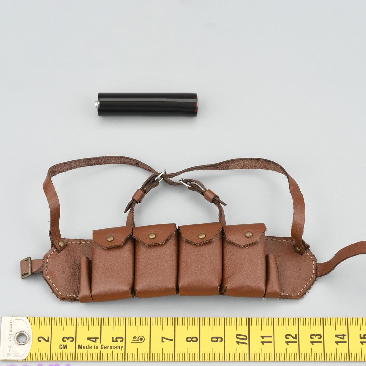 This leather chest rig with belt is a finely crafted 1:6 scale accessory, designed for 12-inch action figures and display models. Made from genuine leather, it delivers a realistic tactical look with detailed stitching and a functional miniature layout.